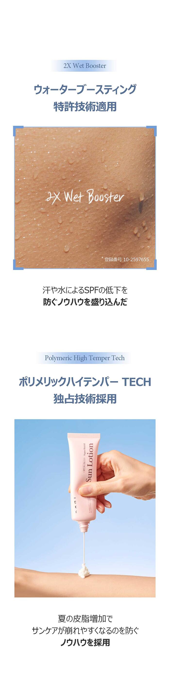 ①ウォーターブースティング技術:汗や水分に反応してSPF効果が高まり、UVケア効果が長持ち。