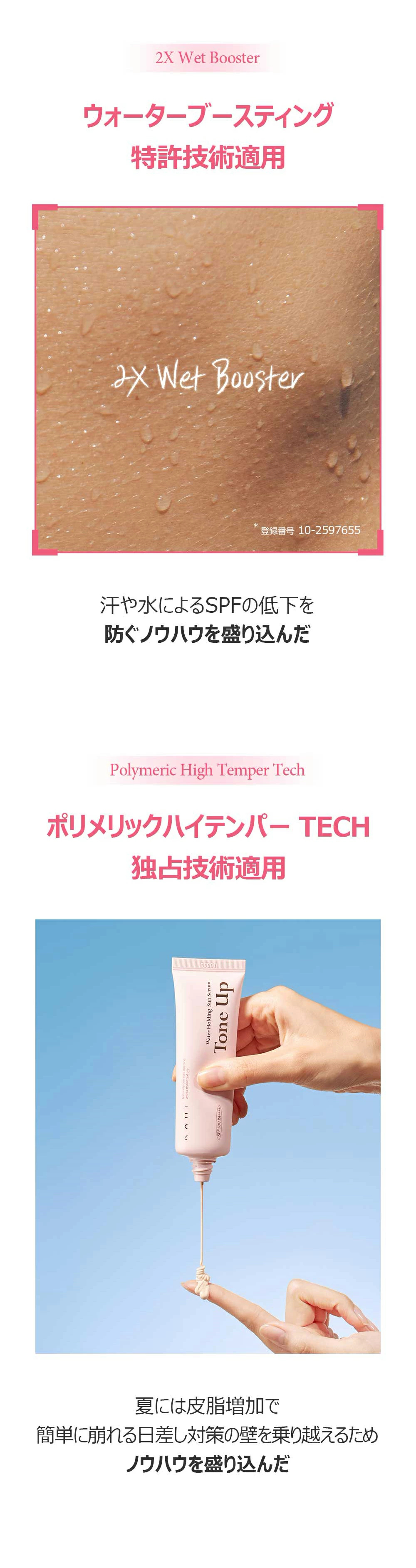 ①ウォーターブースティング技術:汗や水分に反応してSPF効果が高まり、UVケア効果が長持ち。