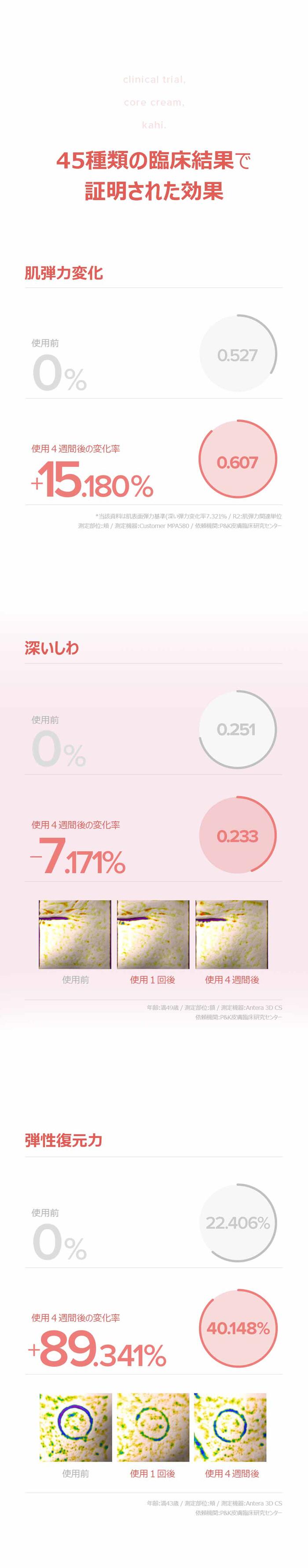 ※1 DNA-Na、加水分解コラーゲン、水溶性プロテオグリカン(すべて整肌成分)※2 チョウセンゴミシ果実エキス、ムラサキ根エキス、クチナシ果実エキス(すべて整肌成分)、ウコン根エキス(香料)※3 ヒアルロン酸Na、ヒアルロン酸、加水分解ヒアルロン酸、加水分解ヒアルロン酸Na、ヒアルロン酸ヒドロキシプロピルトリモニウム、(PEG-9ジグリシジルエーテル/ヒアルロン酸Na)クロスポリマー、ヒアルロン酸K、アセチルヒアルロン酸Na、ヒアルロン酸ジメチルシラノール(すべて保湿成分)※4 年齢に応じたケア ※5 加水分解コラーゲン(整肌成分)※6 DNA-Na(整肌成分) ※7 水溶性プロテオグリカン(整肌成分)