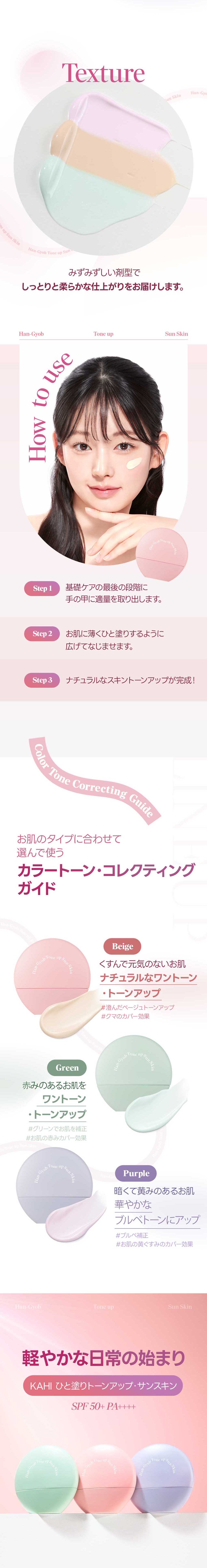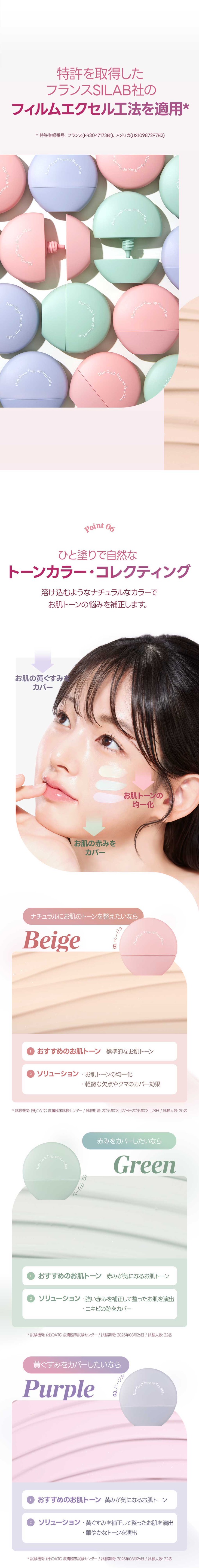 ・パープル:黄味を抑えくすみをカバーし、透明感のある肌色に整えます※1。
