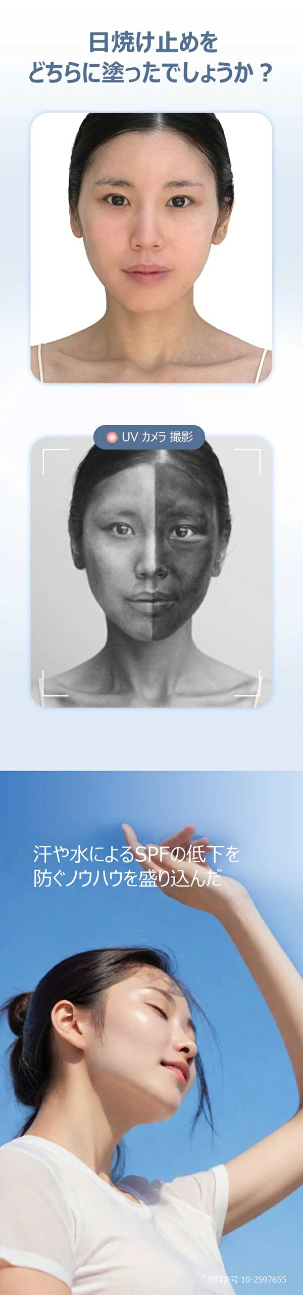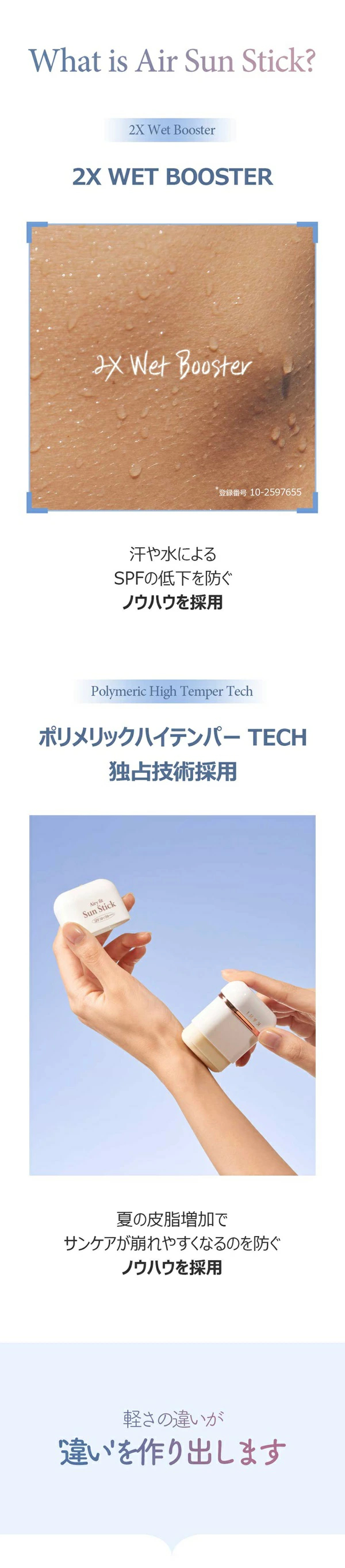 ①ウォーターブースティング技術:汗や水分に反応してSPF効果が高まり、UVケア効果が長持ち。