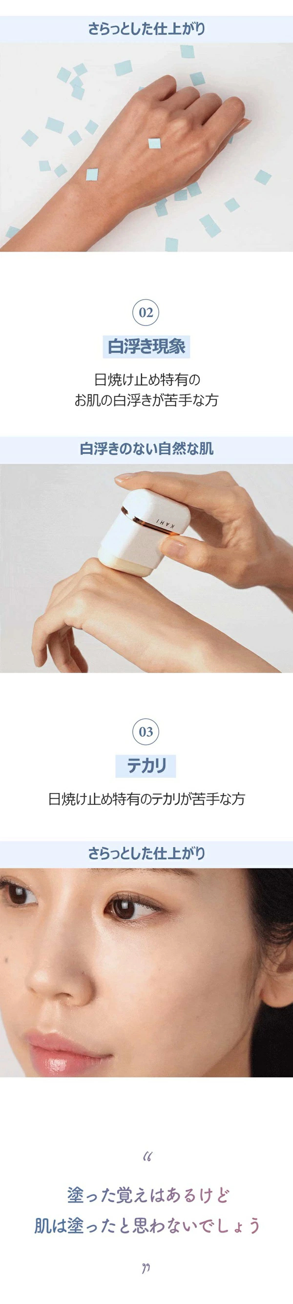 べたつかず肌のテカりを押さえ、重ね塗りをしても肌に負担のない軽い使用感。