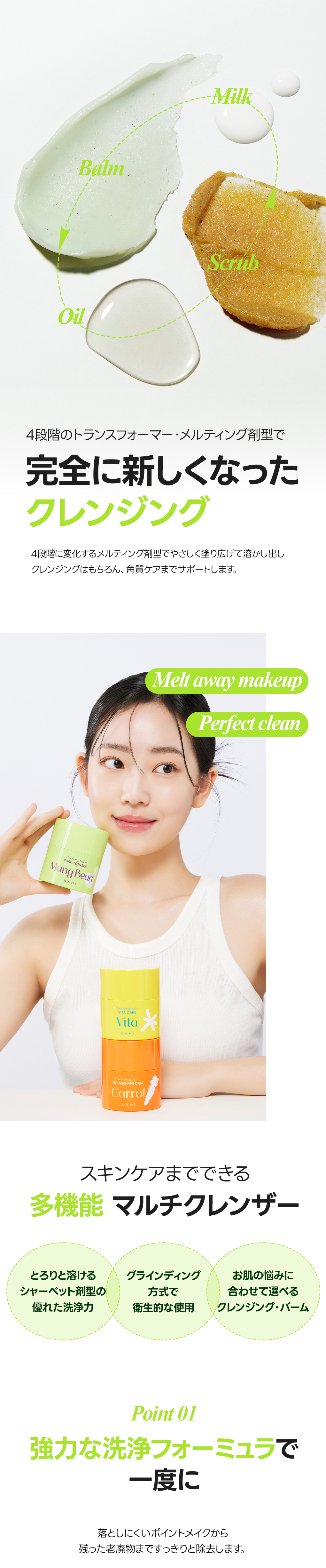 バーム→オイル→スクラブ→ミルクへと変化し、メイクはもちろん、毛穴汚れや古い角質まで一度にケア!