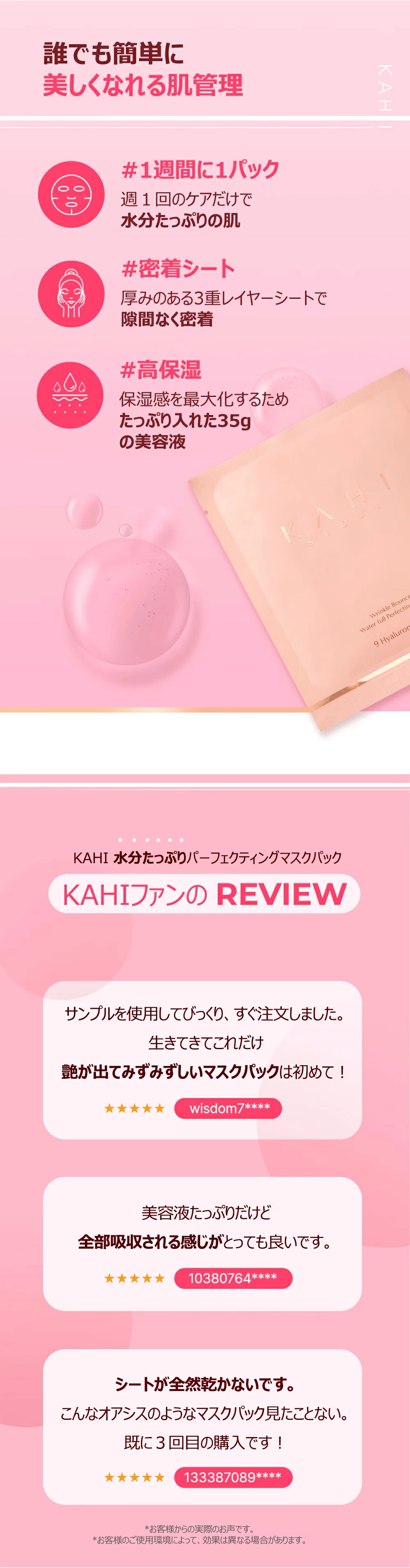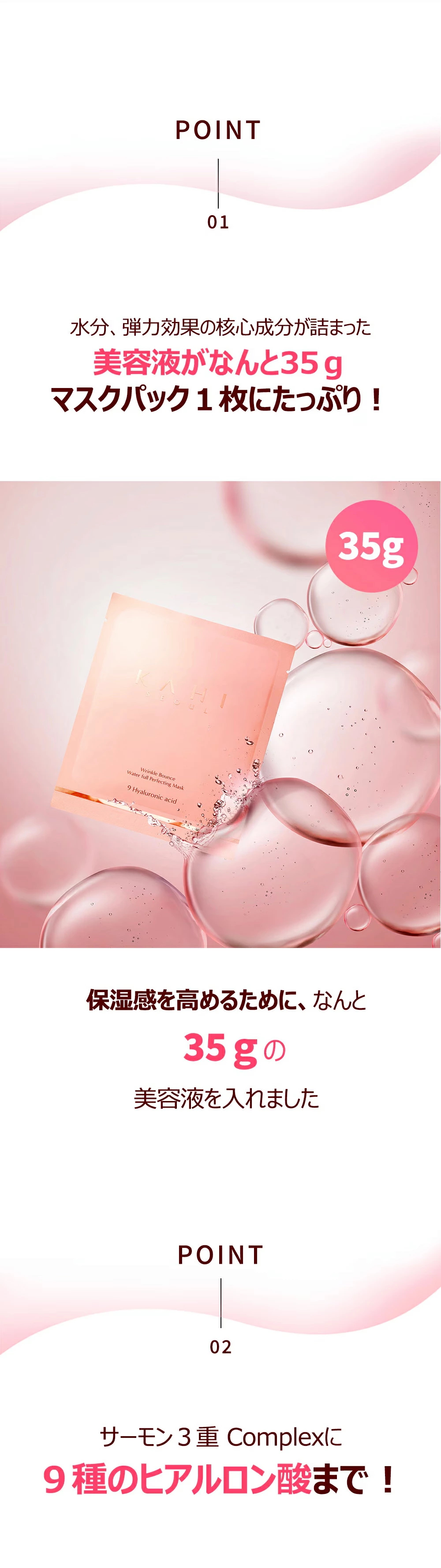 シートマスク1枚にたっぷり35gの美容液を含ませ、みずみずしい肌に。
