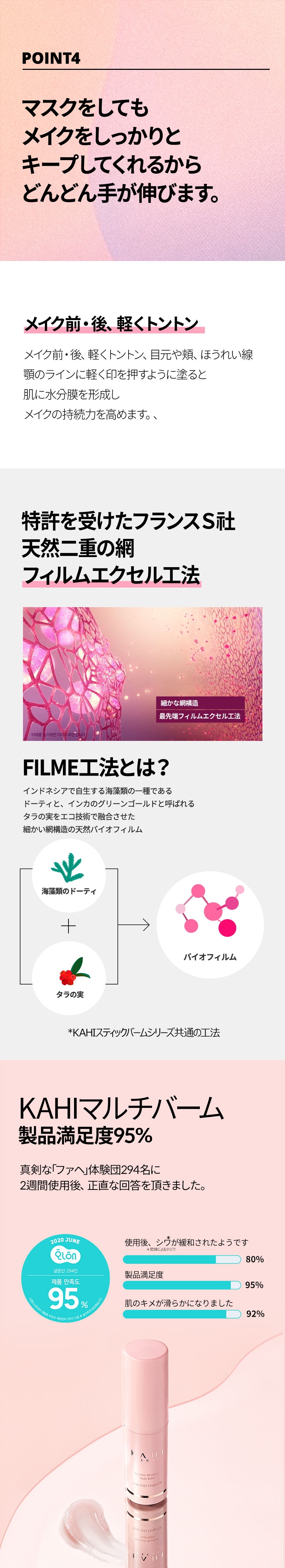 特許技術で2重網構造の天然バイオフィルムで肌に水分膜を作り、メイクの密着力を高めます。